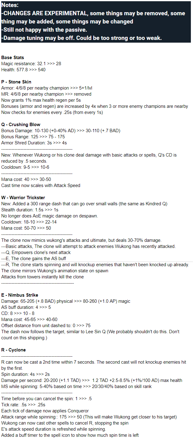 These are the Wukong adjustments that will be shipping to PBE Tuesday (2/25). They are in relation to what was on PBE already (see picture #2). As always, THINGS ARE EXPERIMENTAL. Target patch is 10.6— August (@RiotAugust) February 25, 2020